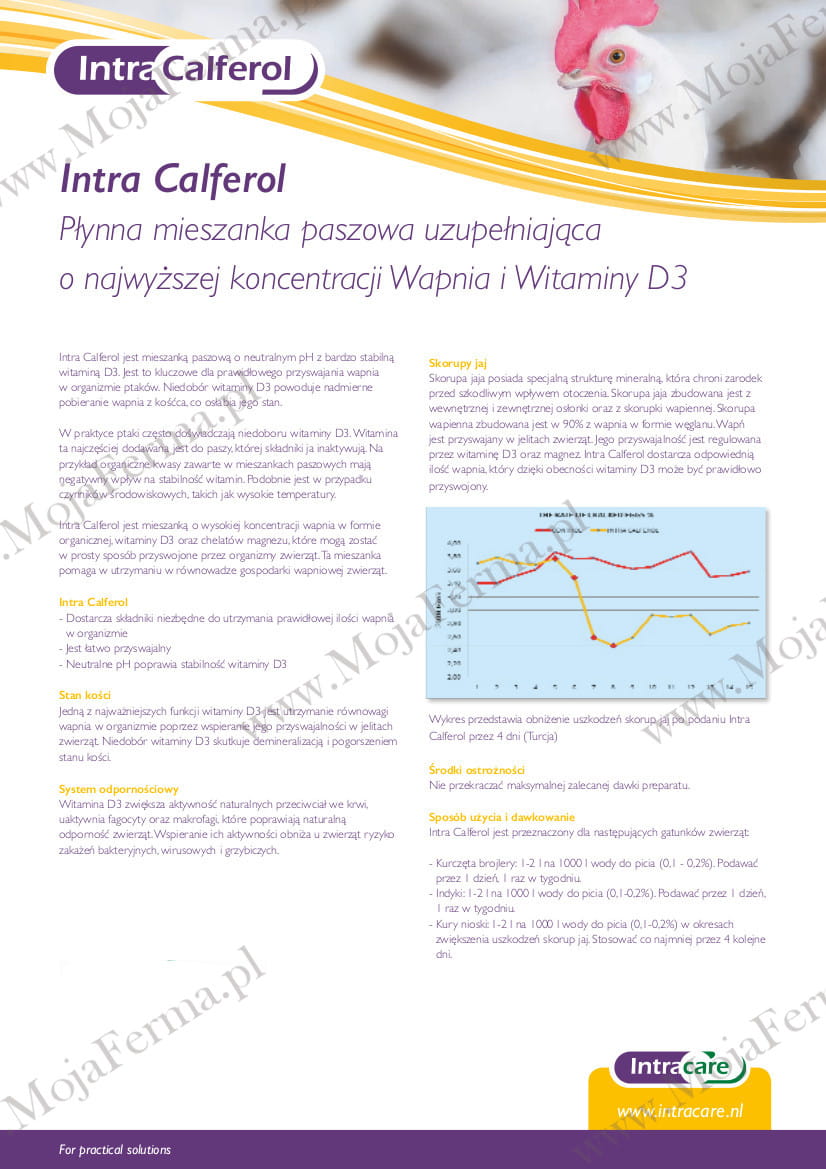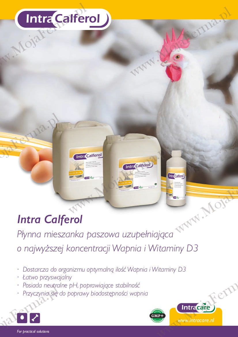 INTRA CALFEROL - preparat przeznaczony dla brojlerów, niosek, bydła i owiec. Zawarta w preparacie witamina D3 jest wyjątkowo stabilna, a mieszanina soli wapnia i glukonianu wapnia decyduje o ich wysokiej dostępności biologicznej. Preparat zalecany jest w przypadku problemów z absorpcją wapnia i fosforu, celem zapobiegania krzywicy, dyschondroplazji, zrzeszotnieniu kości, perozie oraz występowaniu miękkich skorup jaj. Preparat zalecany jest w okresach intensywnego wzrostu i w okresie intensywnej produkcji nieśnej. Ponadto pozwala na utrzymanie stałego poziomu wapnia i magnezu we krwi. Niedobór witaminy D3 powoduje nadmierne pobierania Wapnia z kośćca, co prowadzi do jego osłabienia. INTRA CALFEROL posiada neutralne pH, dzięki czemu zawarta w nim witamina D3 jest bardziej stabilna.