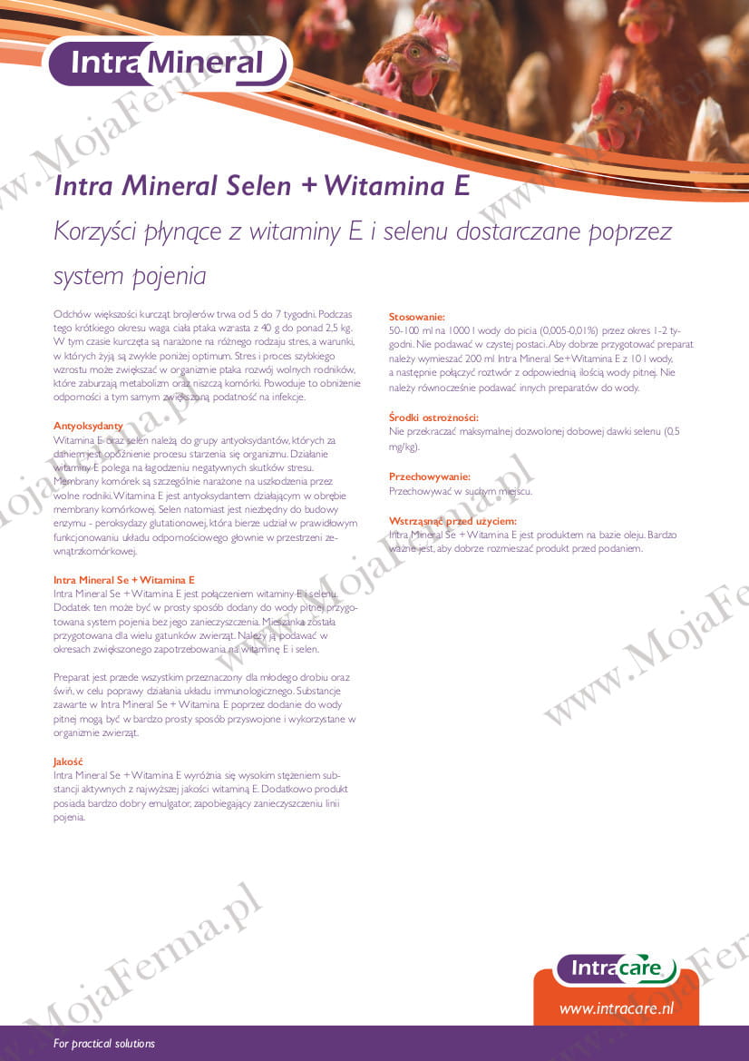 Intra Mineral Se + Witamina E jest połączeniem witaminy E i selenu. Dodatek ten może być dodawany do wody pitnej. Mieszanka została przygotowana dla wielu gatunków zwierząt. Należy ją podawać w okresach zwiększonego zapotrzebowania na witaminę E i/lub selen. Preparat jest przede wszystkim przeznaczony dla młodego drobiu oraz świń, w celu poprawy działania układu immunologicznego. Substancje zawarte w Intra Mineral Se + Witamina E są wysoce przyswajalne przyswojone i wykorzystane w organizmie zwierząt.